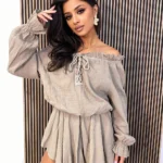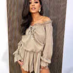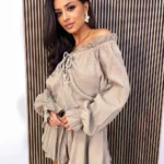 Spódnico–spodenki nadają mu swobodnego charakteru, a jednocześnie podkreślają sylwetkę, łącząc styl i funkcjonalność. Delikatna struktura muślinu dodaje całości lekkości i naturalnego uroku.
