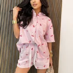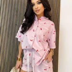 Bawełniany komplet w urocze wisienki to idealna propozycja na ciepłe dni dla kobiet, które cenią wygodę i dziewczęcy styl. Zestaw składa się z koszuli z krótkim rękawem oraz komfortowych spodenek na gumce, tworząc lekką i stylową całość.