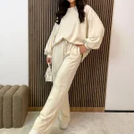 Ten dres z bluzą i szerokimi spodniami to doskonały wybór dla osób ceniących styl, wygodę i uniwersalność. Idealny na spacer, podróż, zakupy lub relaks.