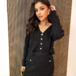 Sweterek z klasycznym dekoltem i eleganckimi guzikami pięknie układa się na sylwetce, a dopasowana spódnica mini podkreśla kobiece kształty, zachowując przy tym pełen komfort noszenia. Warkoczowy splot dodaje całości wyjątkowego uroku i przytulnego charakteru.