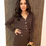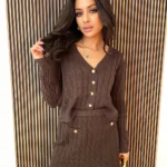 Sweterek zapinany na guziki i krótka spódnica sweterkowa – stylowy komplet w warkoczowy splot