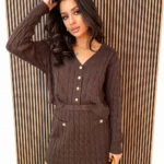 Sweterek z klasycznym dekoltem i eleganckimi guzikami pięknie układa się na sylwetce, a dopasowana spódnica mini podkreśla kobiece kształty, zachowując przy tym pełen komfort noszenia. Warkoczowy splot dodaje całości wyjątkowego uroku i przytulnego charakteru.
