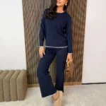 Stylowy komplet, który łączy wygodę i elegancję. Miękki sweterek z długim rękawem wykonany z przyjemnej w dotyku dzianiny zapewnia komfort noszenia przez cały dzień. Klasyczny krój z delikatnym wykończeniem przy dekolcie i rękawach sprawia, że świetnie dopasowuje się do sylwetki, podkreślając jej atuty.