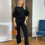Szerokie spodnie typu szwedy zapewniają swobodę ruchów i elegancki wygląd, a jednocześnie są niezwykle wygodne dzięki lekkości i miękkości materiału. Wiskoza sprawia, że zarówno sweterek, jak i spodnie są przyjemne w dotyku i doskonale układają się na sylwetce, podkreślając jej atuty.