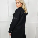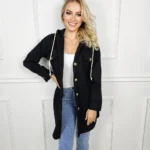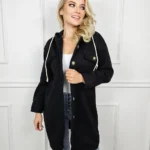 Poznaj naszą elegancką i funkcjonalną materiałową kurtkę z kapturem, zapinaną na guziki, która sięga do połowy uda. Ta kurtka łączy w sobie nowoczesny styl z praktycznością, idealna na chłodniejsze dni.