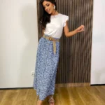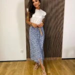 Kwiatowa spódnica z wiskozy – pasek + imitacja guzików