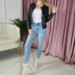 Spodnie jasne z delikatnymi dziurami to idealna propozycja dla osób poszukujących stylowego i wygodnego elementu garderoby. Wykonane z rozciągliwego materiału, zapewniają pełną swobodę ruchów i komfort noszenia. Dziury dodają im modnego i nieco zniszczonego wyglądu, który świetnie komponuje się z casualowymi stylizacjami. Doskonale sprawdzą się zarówno na co dzień, jak i na wieczorne wyjścia. Klasyczny fason spodni połączony z nowoczesnymi detalami sprawia, że są one uniwersalnym elementem garderoby, który można zestawić z różnymi topami i butami.