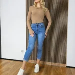 Spodnie damskie jeansowe w modelu mom fit są idealnym wyborem dla wszystkich, którzy szukają połączenia wygody i stylu. Ich jasny kolor dodaje im świeżości i elegancji, tworząc doskonały kontrast do codziennego ubioru. Wykonane z wysokiej jakości materiałów premium, te spodnie są trwałe i odporne na uszkodzenia. Co więcej, ich gładka powierzchnia nie posiada żadnych dziur ani zacięć, co sprawia, że są one idealne zarówno do casualowych, jak i bardziej formalnych stylizacji. Przeznaczone do noszenia na co dzień, te jeansy będą doskonałym uzupełnieniem twojej garderoby.