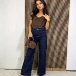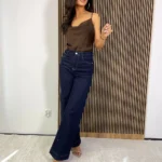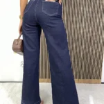 Rozszerzane nogawki i wysoki stan optycznie wydłużają nogi i podkreślają talię, tworząc proporcjonalną i stylową sylwetkę. Minimalistyczny, jednolity kolor bez przetarć sprawia, że spodnie są uniwersalne i pasują zarówno do casualowych, jak i bardziej eleganckich stylizacji.