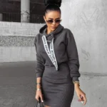 góra produktu oraz przylegająca, prążkowana dolna część sukienki. Prążkowane brzegi. Na przodzie logo