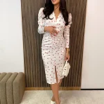 Długie rękawy dodają klasycznej elegancji, idealnie komponując się z głębokim dekoltem, który subtelnie eksponuje szyję i ramiona. Sukienka doskonale sprawdzi się zarówno na formalne wyjścia, jak i mniej zobowiązujące spotkania, oferując wygodę i kobiecy urok. Wykonana z wysokiej jakości materiałów, zapewnia komfort noszenia przez cały dzień lub wieczór.