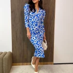 Długie rękawy dodają klasycznej elegancji, idealnie komponując się z głębokim dekoltem, który subtelnie eksponuje szyję i ramiona. Sukienka doskonale sprawdzi się zarówno na formalne wyjścia, jak i mniej zobowiązujące spotkania, oferując wygodę i kobiecy urok. Wykonana z wysokiej jakości materiałów, zapewnia komfort noszenia przez cały dzień lub wieczór.