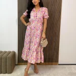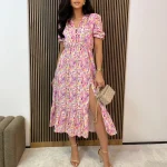 Ta sukienka midi to połączenie klasycznego kroju i subtelnej zmysłowości. Krótkie rękawy dodają lekkości i świeżości, idealnie komponując się z długą długością sukienki, która sprawia, że całość wygląda elegancko i kobieco. Zapinana na guziki, sukienka oferuje możliwość regulacji dekoltu i długości, co sprawia, że możesz dostosować ją do swojego stylu.