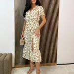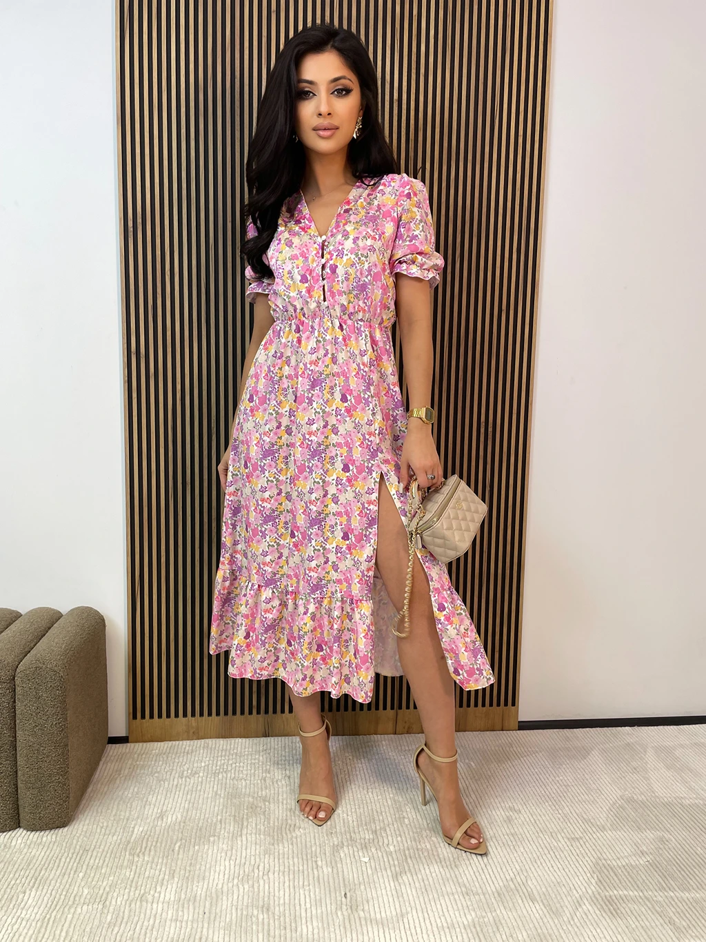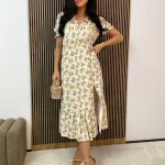 Ta sukienka midi to połączenie klasycznego kroju i subtelnej zmysłowości. Krótkie rękawy dodają lekkości i świeżości, idealnie komponując się z długą długością sukienki, która sprawia, że całość wygląda elegancko i kobieco. Zapinana na guziki, sukienka oferuje możliwość regulacji dekoltu i długości, co sprawia, że możesz dostosować ją do swojego stylu.