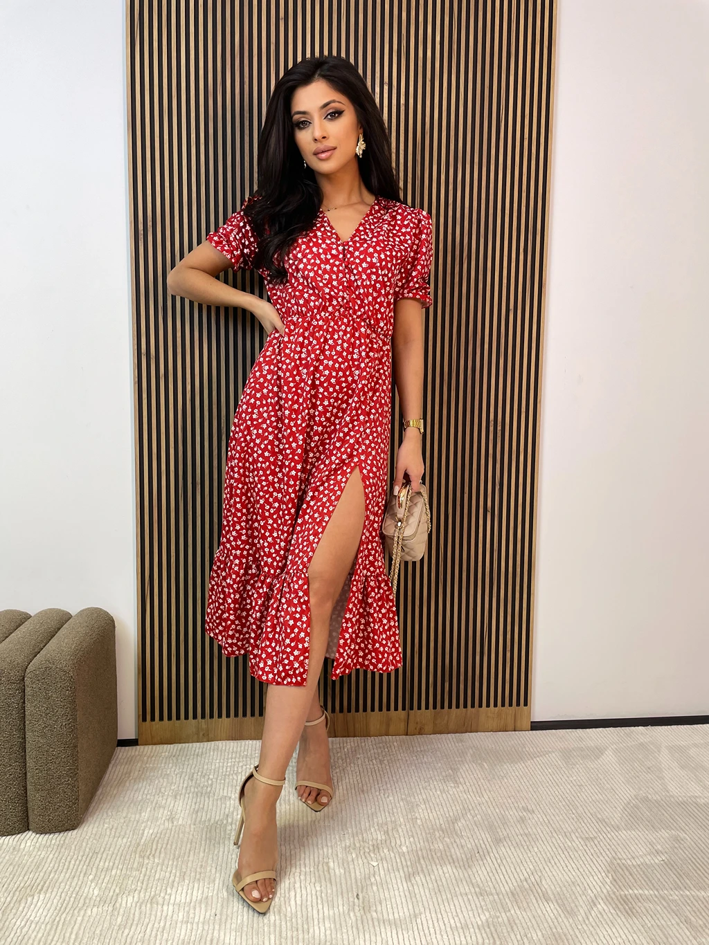 Ta sukienka midi to połączenie klasycznego kroju i subtelnej zmysłowości. Krótkie rękawy dodają lekkości i świeżości, idealnie komponując się z długą długością sukienki, która sprawia, że całość wygląda elegancko i kobieco. Zapinana na guziki, sukienka oferuje możliwość regulacji dekoltu i długości, co sprawia, że możesz dostosować ją do swojego stylu.