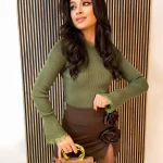 Odkryj ponadczasową elegancję w codziennym wydaniu. Nasz sweterek z okrągłym dekoltem to idealne połączenie wygody i stylu. Wykonany z prążkowanego materiału pięknie układa się na sylwetce, podkreślając jej atuty. Rozkloszowane rękawy dodają mu lekkości i subtelnego charakteru, dzięki czemu świetnie sprawdzi się zarówno na co dzień, jak i w bardziej wyjątkowych stylizacjach. Dodatkowo całego uroku dodaje delikatna koronka na zakończeniach