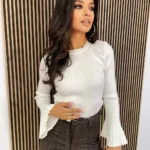 Odkryj ponadczasową elegancję w codziennym wydaniu. Nasz sweterek z okrągłym dekoltem to idealne połączenie wygody i stylu. Wykonany z prążkowanego materiału pięknie układa się na sylwetce, podkreślając jej atuty. Rozkloszowane rękawy dodają mu lekkości i subtelnego charakteru, dzięki czemu świetnie sprawdzi się zarówno na co dzień, jak i w bardziej wyjątkowych stylizacjach.