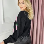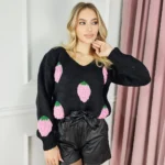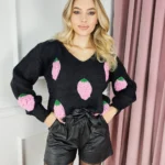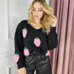 Ten sweter to ciepłe i modowe uzupełnienie Twojej garderoby. Wykonany z miłego w dotyku materiału, zapewnia komfort noszenia przez cały dzień. Jego oversizeowy fason pozwala na swobodę ruchów, a doszywane poziomki dodają mu uroku i oryginalności. Świetnie sprawdzi się jako centralny element stylizacji na chłodniejsze dni.